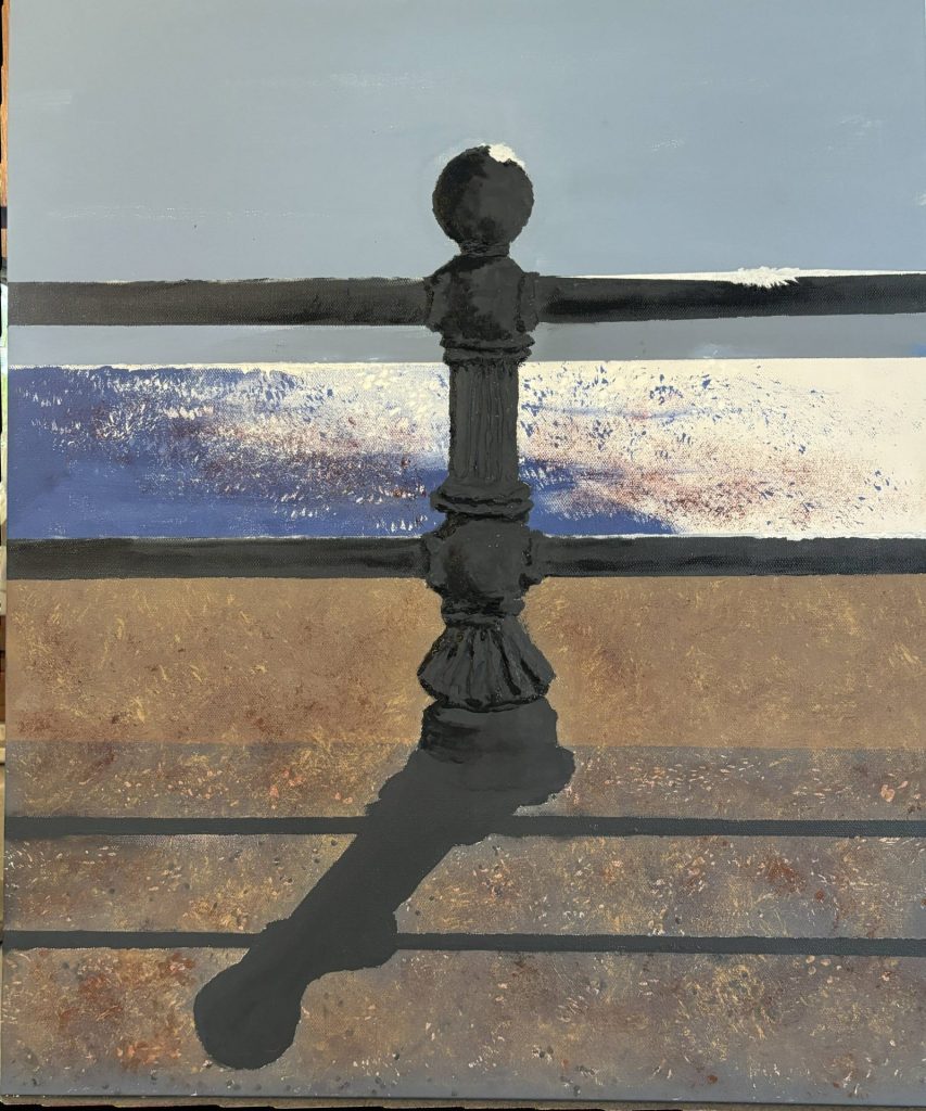 April 2024 Virginia Beach sunrise view with inanimate subject. Oill on canvas 20 x 24